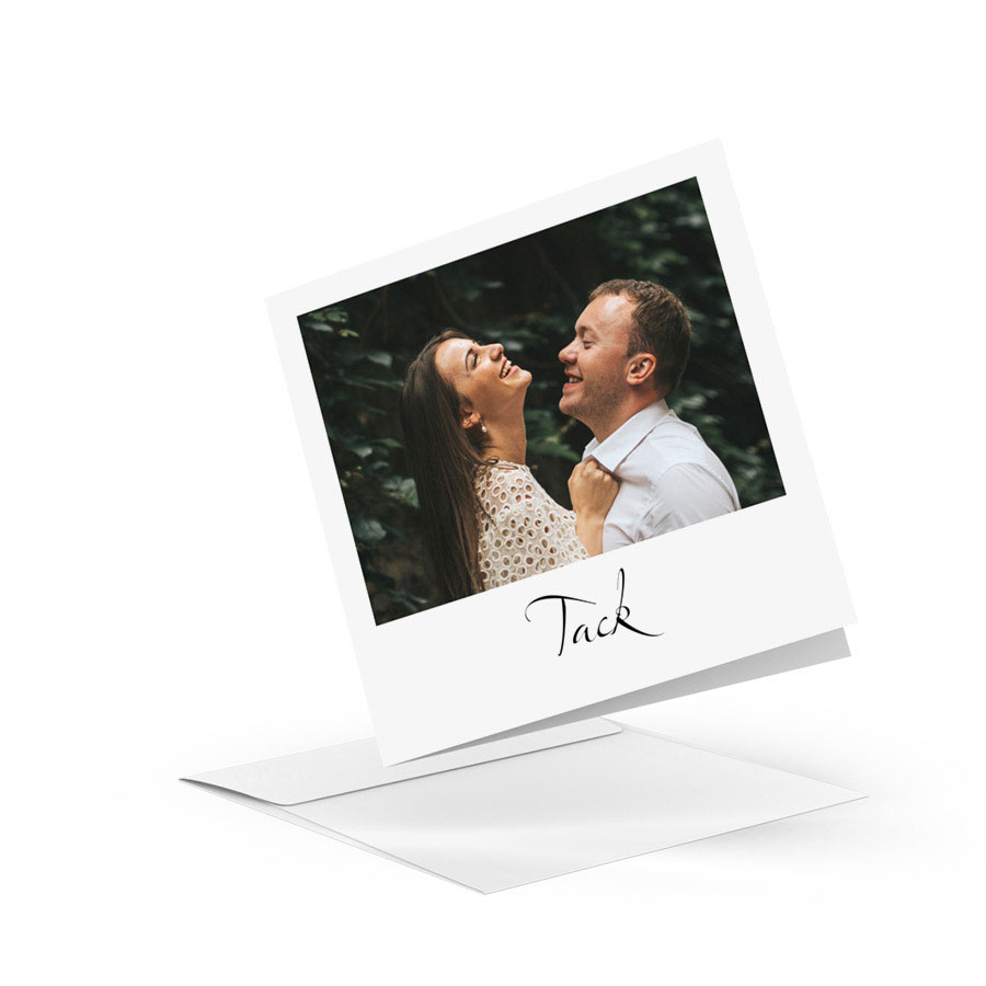 Tacka gästerna på ett vackert och personligt sätt. Välj en favoritbild från bröllopsdagen och skapa ett tackkort som blir ett minne.