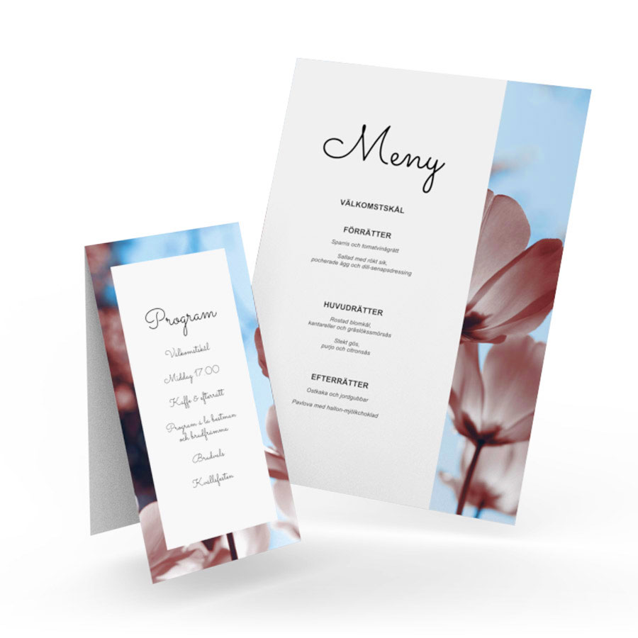 En enhetlig visuell stil fulländar dukningen. Skapa meny-, program- och placeringskort som passar ert tema – enkelt med egna bilder och valda typsnitt.