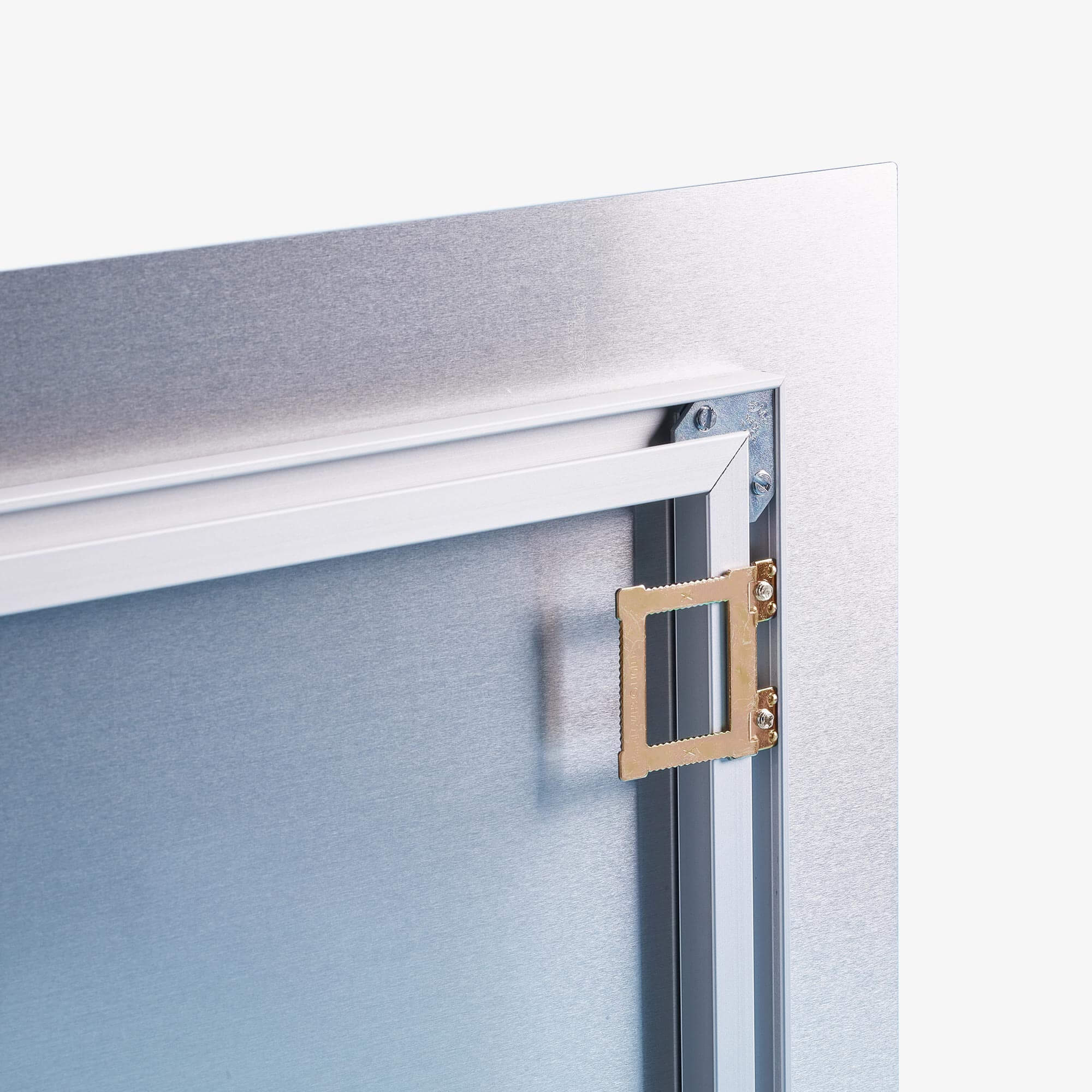 Bakom metalltavlan finns en fästskena i aluminium som lyfter panelen från väggen. Detta ger intrycket av att tavlan svävar på väggen. Tavlan är lätt att hänga upp på de fyrkantiga fästena (skruvar ingår ej).