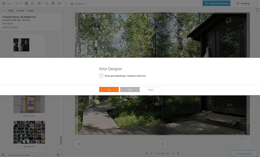 Du behöver inte göra klart fotoboken på en gång, utan du kan ta det i din egen takt. Du kan skapa din fotobok i lugn och ro, spara den i slutet och fortsätta en annan dag.