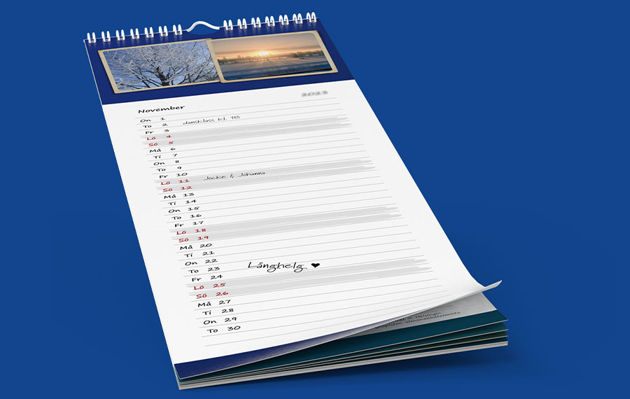 En väggkalender som passar även i smala utrymmen är ett roligt sätt att hålla sig uppdaterad. Illustrera varje månad med egna bilder och skriv de viktigaste händelserna i kalendern. Tack vare den bekväma storleken är kvaliteten på mobilfoton också tillräckligt bra för denna fotokalender. Designa din egna kökskalender till köket, hallen och barnrummet!