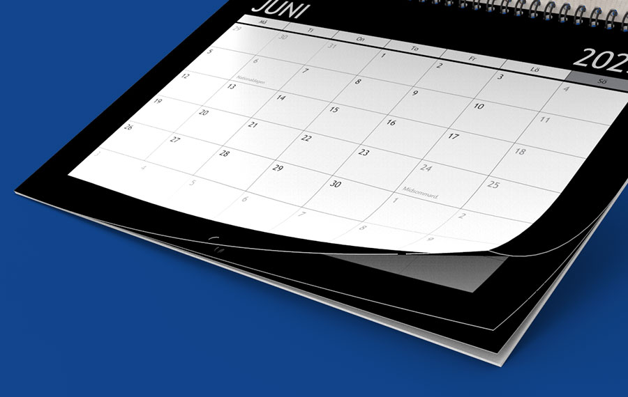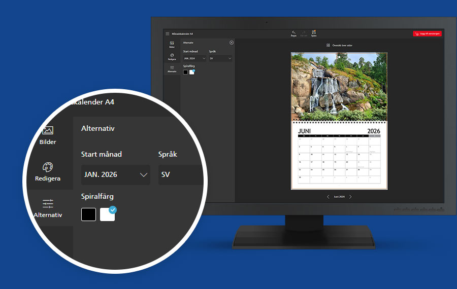 Är året redan i full gång och du behöver fortfarande en kalender? Inga bekymmer, du kan enkelt välja startmånad för din kalendern. Du kan också ändra bakgrundsfärgen, välj antingen svart eller vit. Att göra ändringar och lägga till bilder är enkelt både i webbläsaren och med Designer-programmet.