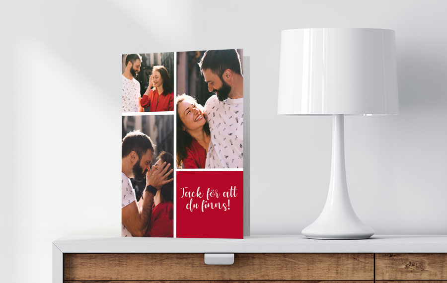 Det finns gott om val i olika layouter. Inuti det vikta XL-kortet får du plats med massor av viktiga tankar, fraser, dikter, gratulationer, önskningar eller sångtexter. Du kan välja storlek, teckensnitt och färg på texten. Din personliga hälsning kan få pricken på i:et med ditt eget handskrivna namn.