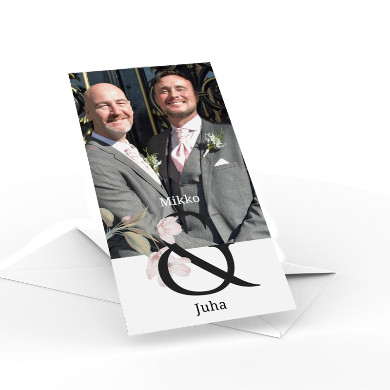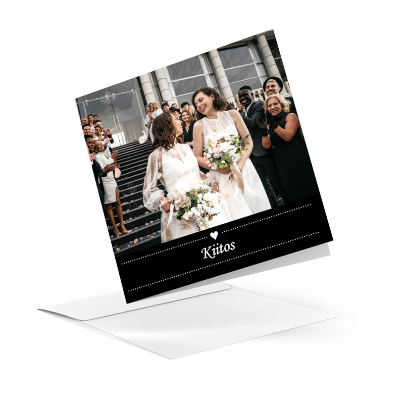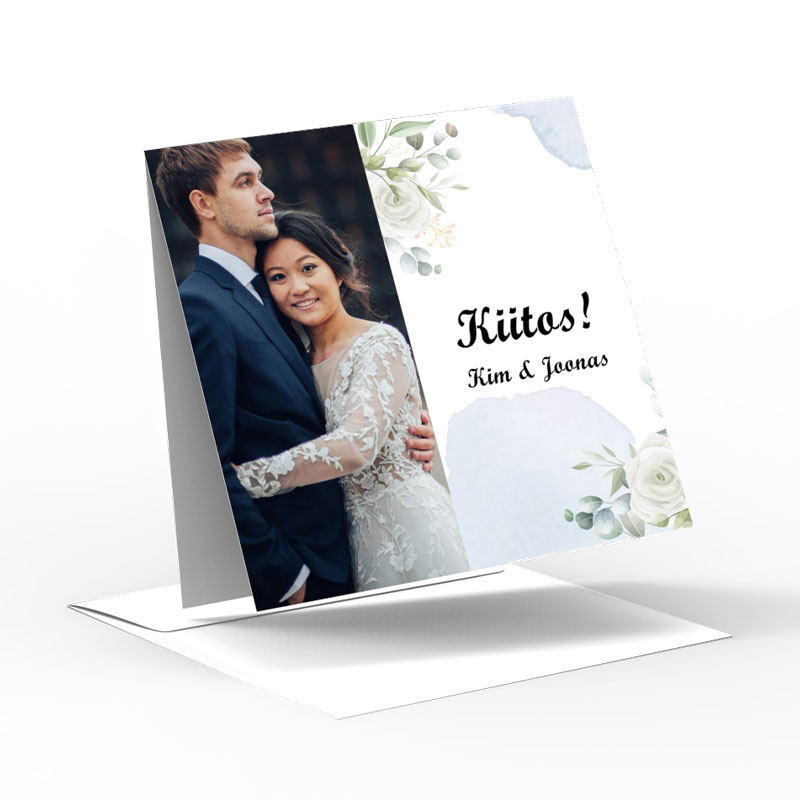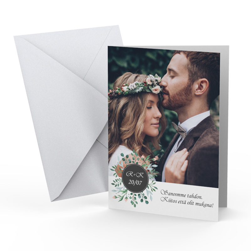 Dina gäster kommer att göra bröllopsdagen till en fest som man kommer att minnas med glädje. Vackra tackkort för bröllop krönar en perfekt dag av firande. Du kan välja en kortbild med en bild eller göra ett kollage av bröllopsdagens viktiga ögonblick.